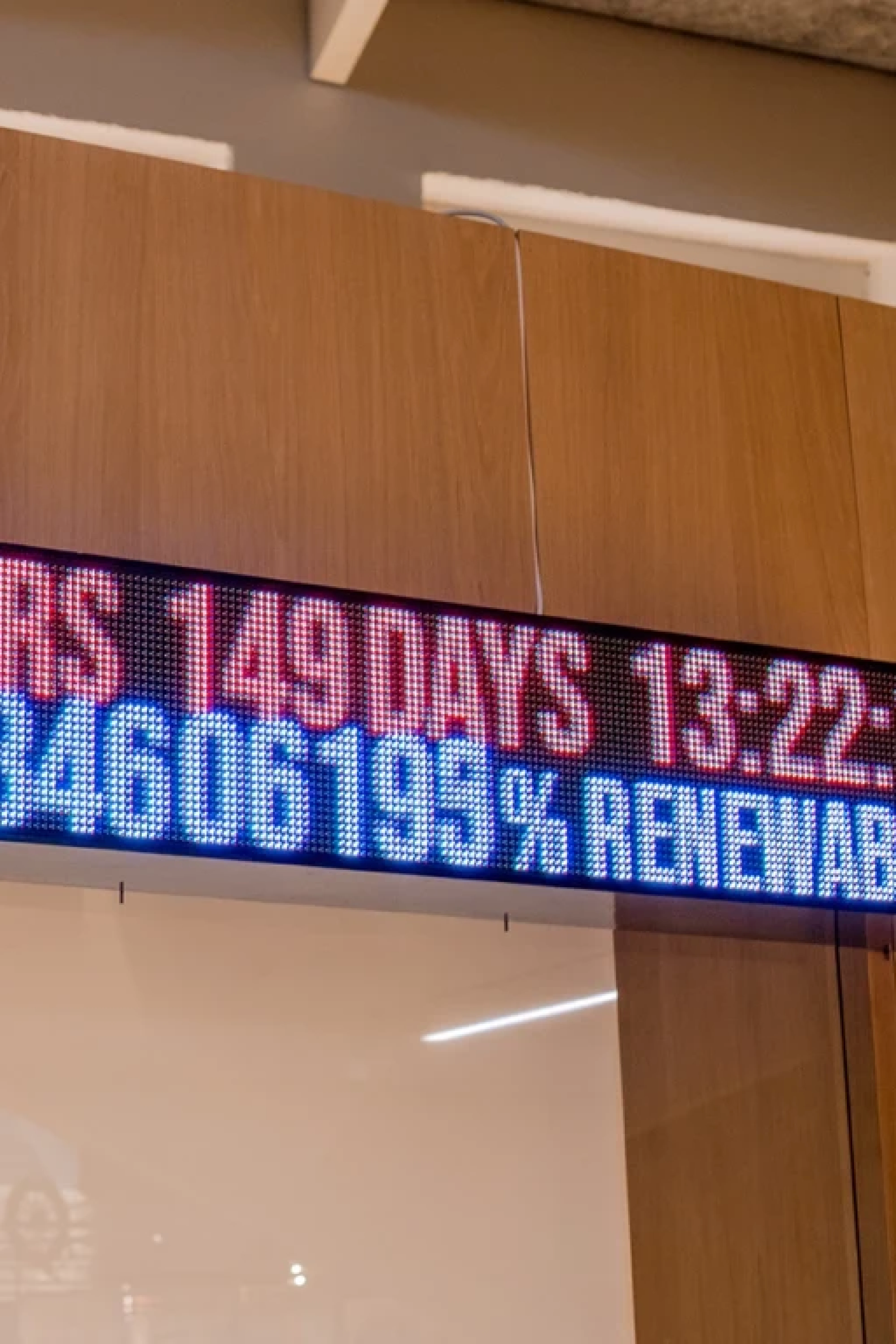 At the bottom of the screen, in blue-green, the clock displays three lifelines, or actions being taken to slow down the clock. One lifeline is the percentage of energy produced worldwide from renewable sources. Another is the amount of money committed to the Green Climate Fund, a global fund to support developing countries in limiting the effects of climate change. The third lifeline is the amount of land protected by Indigenous people worldwide.