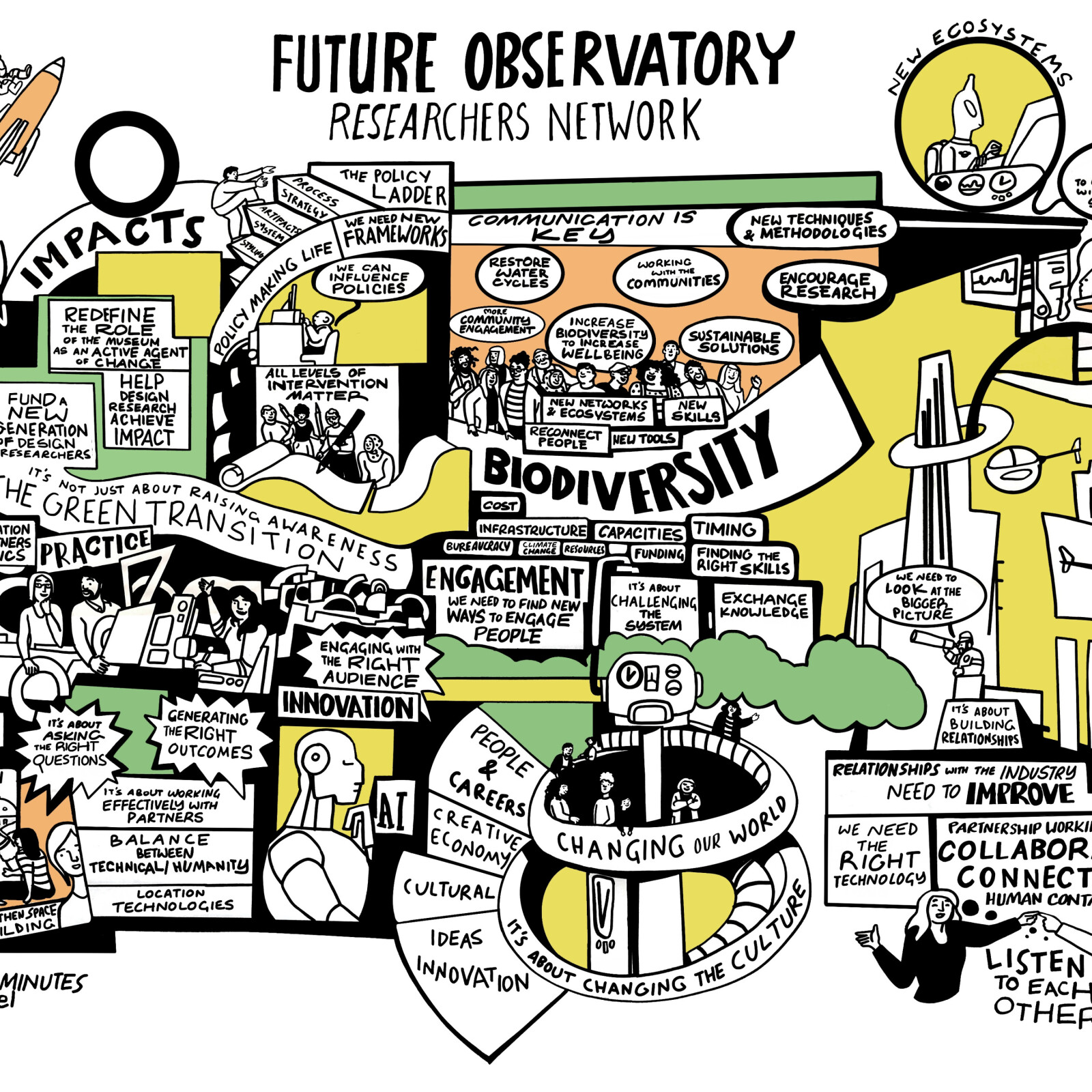 To address the specifics of the application process, McGuirk summarised the purpose of a GTE, the composition of its consortia, and the types of activity that could be funded. He was then joined by Sudlow, Cher Potter (Future Observatory Curatorial Director), and Katherine Mansfield (Senior Investment Manager at AHRC) for a lively Q&A session with the audience. During this, audience members asked for clarification on the presentation points and application requirements, with particular interest in the speed of the research period for the GTEs. McGuirk responded that the scale of the funding, the speed of its delivery, and the need for agility and contingency planning were all necessary in the urgent context of the climate crisis.