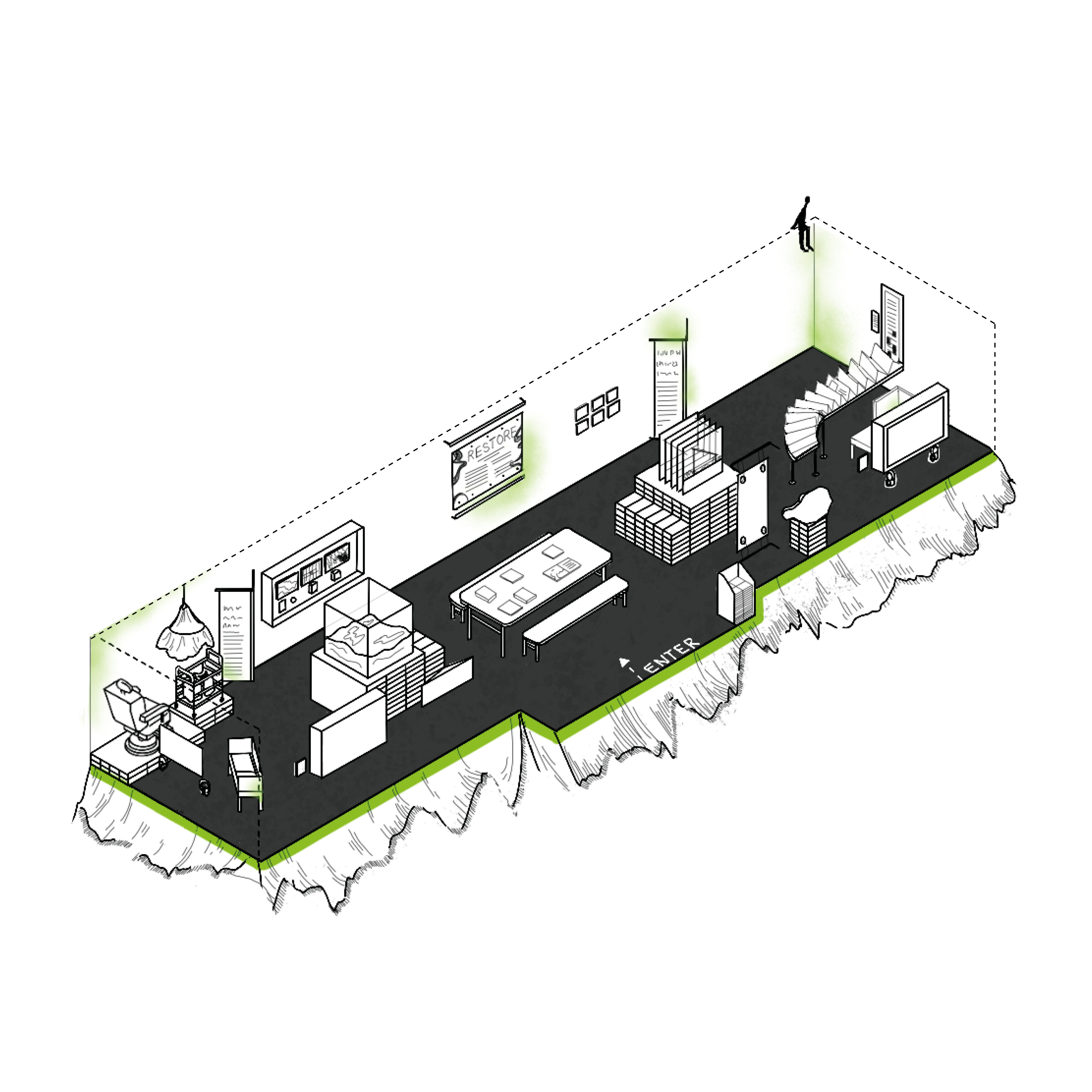 Within this drawing we start to examine some of these environmental questions that accompany sustainable exhibition design. Where did we source materials from? What can be re-used or recycled when the display is taken down? And how do we maintain and repair things to avoid buying new ones?