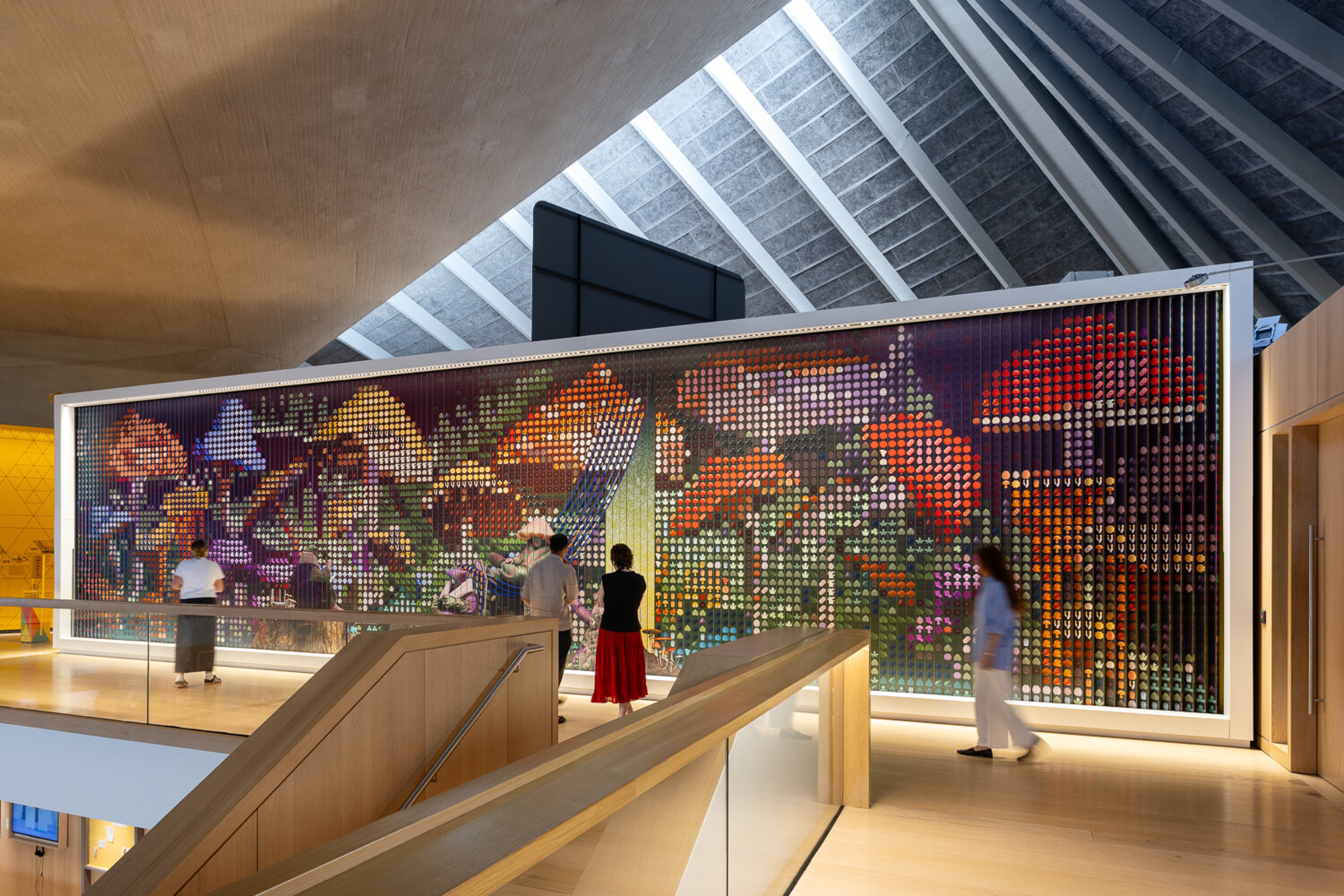 From afar, the artworks show a meadow with flowers, mushrooms, or a coral reef. Up close, they reveal hundreds of icons representing ecosystems and human interactions, including elements that change, pollute, or mimic nature.