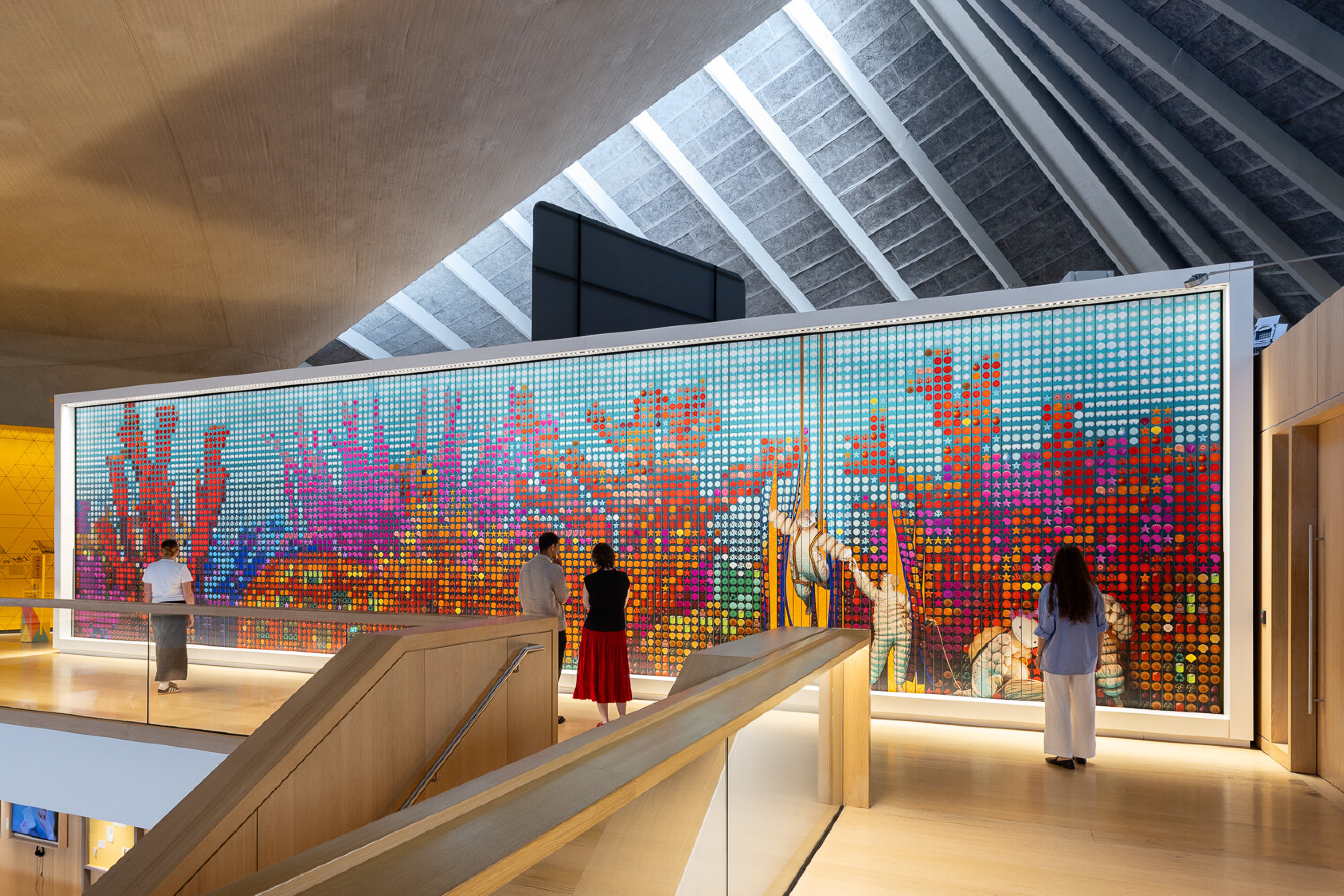 Coral larvae are attracted to the tingling, bubbly sound of healthy reefs. In fact, this sound can be played in dead reefs to attract larvae to revive them. The bubbly quality of these sounds is translated into patterns revealed behind the coral reef frieze.