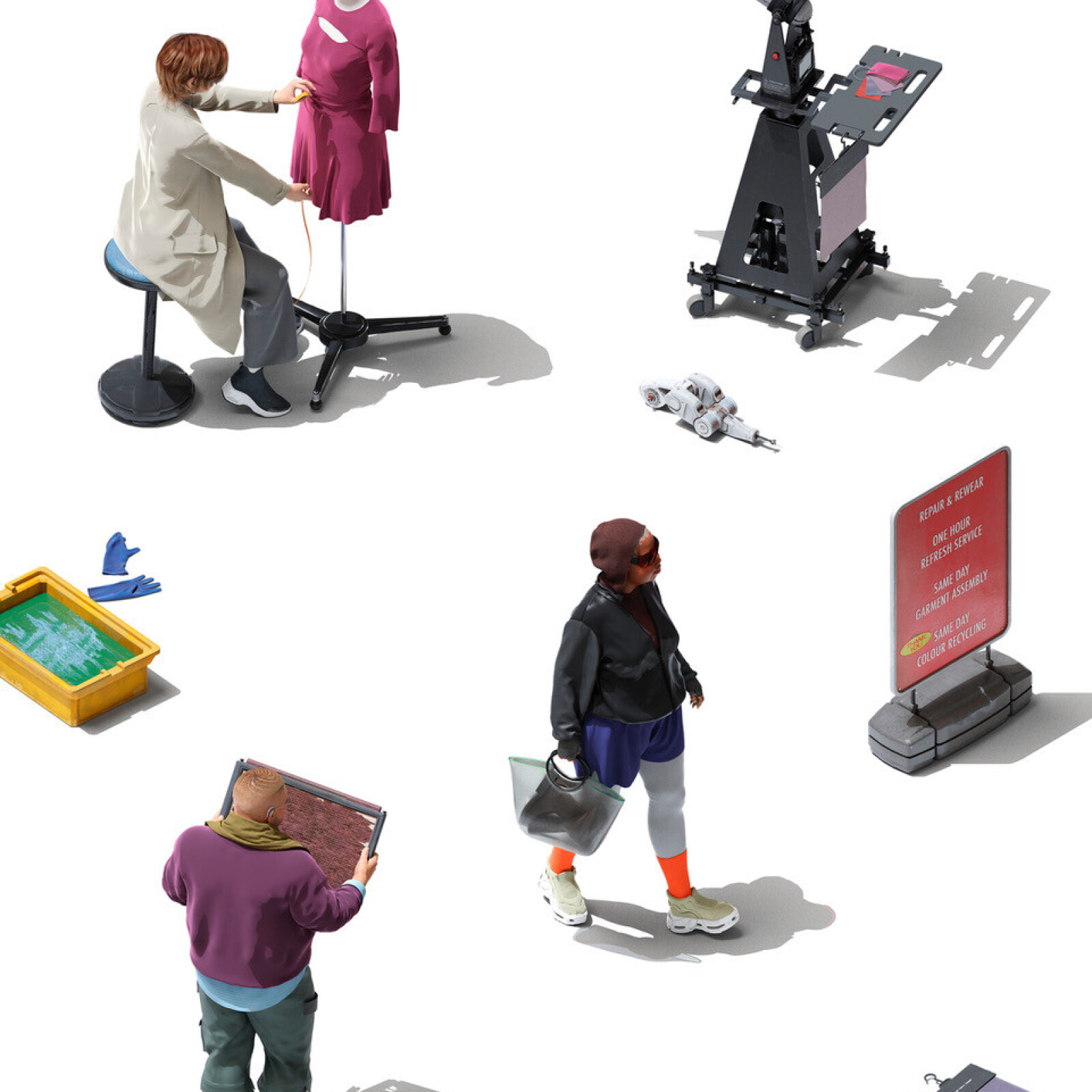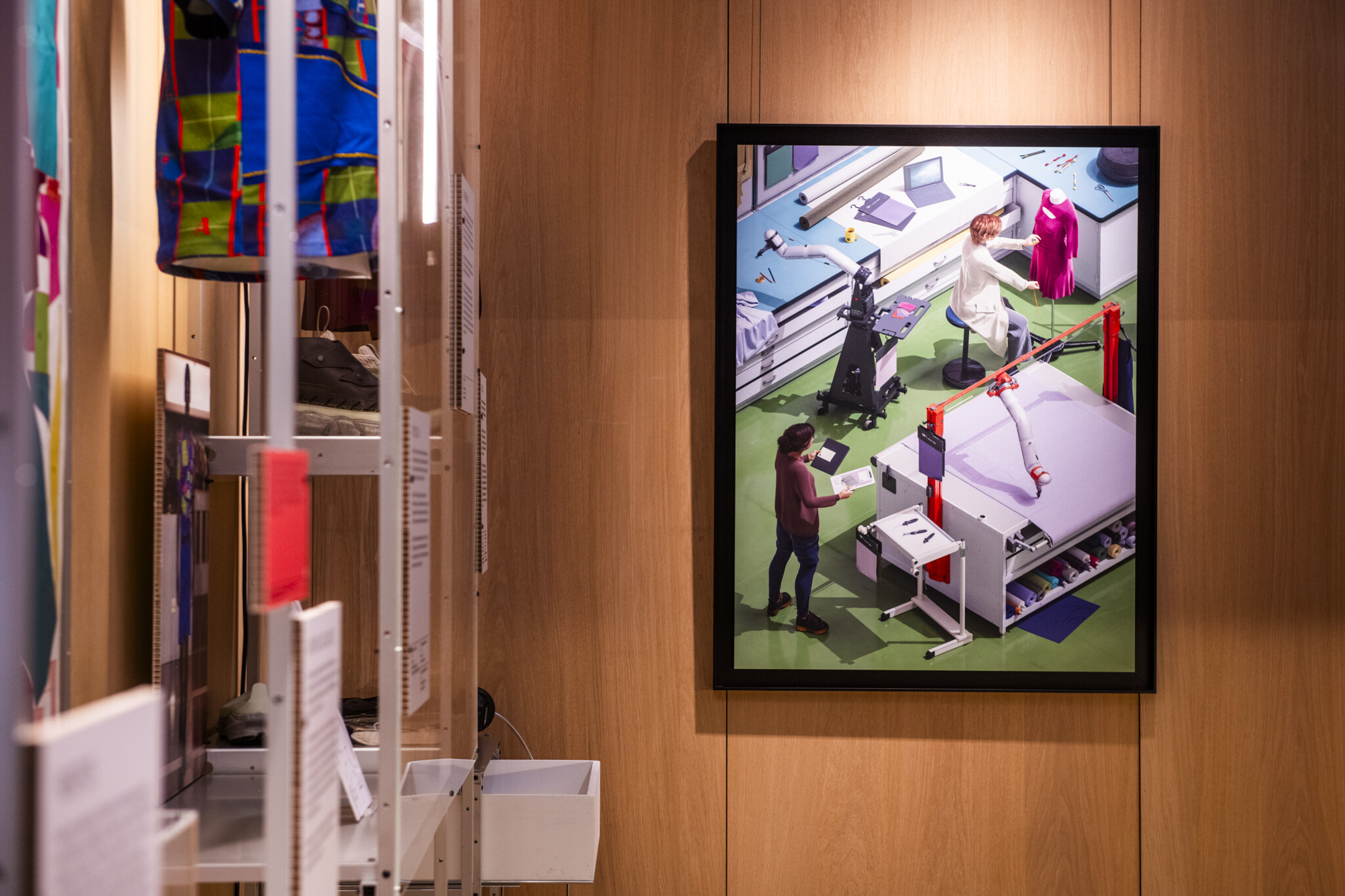 Tomorrow’s Wardrobe showcases the urgent research and innovation taking place across the UK to rethink how the world of fashion works. Moving from fabric landscapes to design studios to individual garments, the display presents a future built from both high-tech and low-tech tools: sewing machines, robotic arms, artificial intelligence, digital ids, upcycling, recycling and more.
