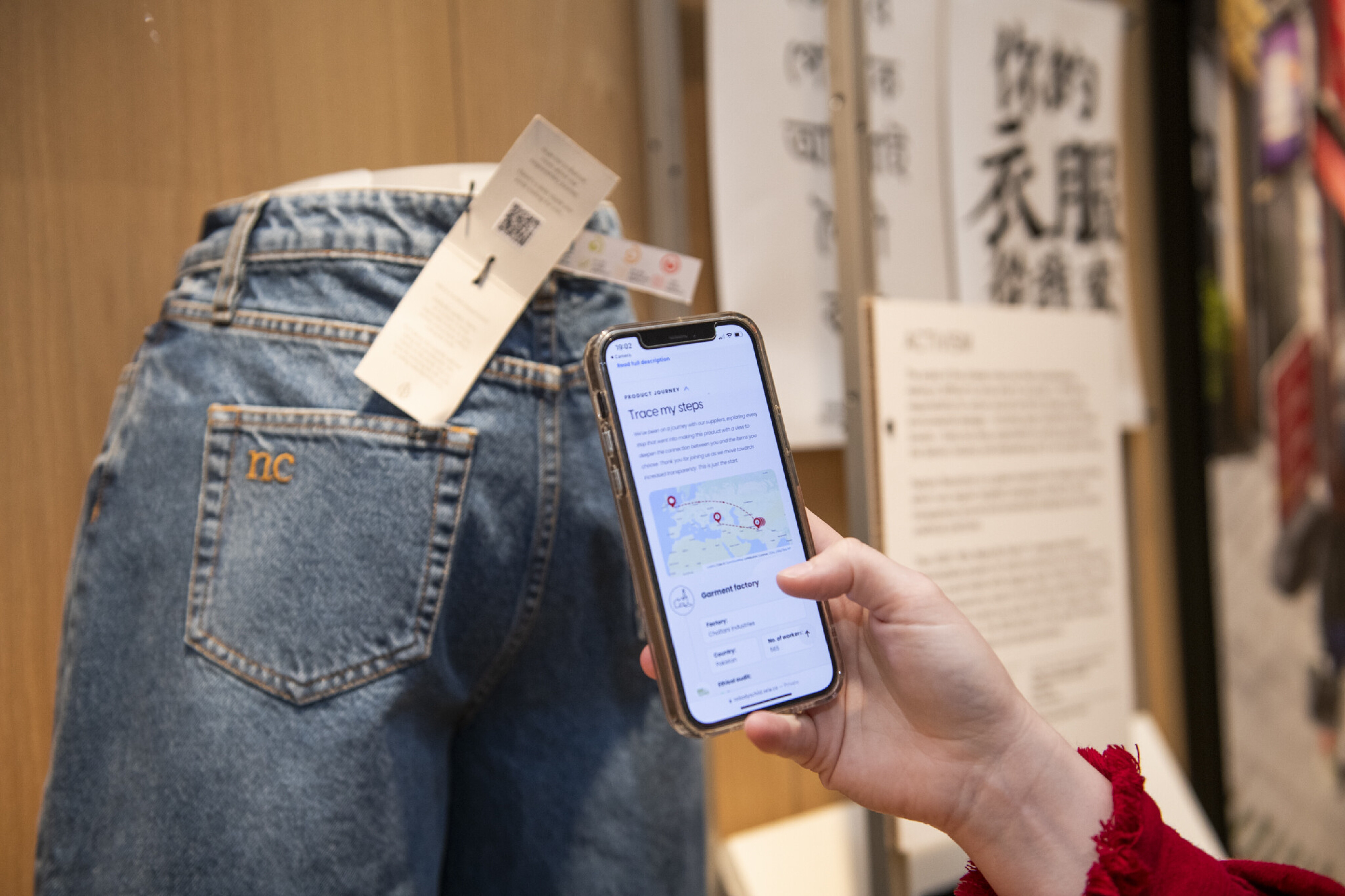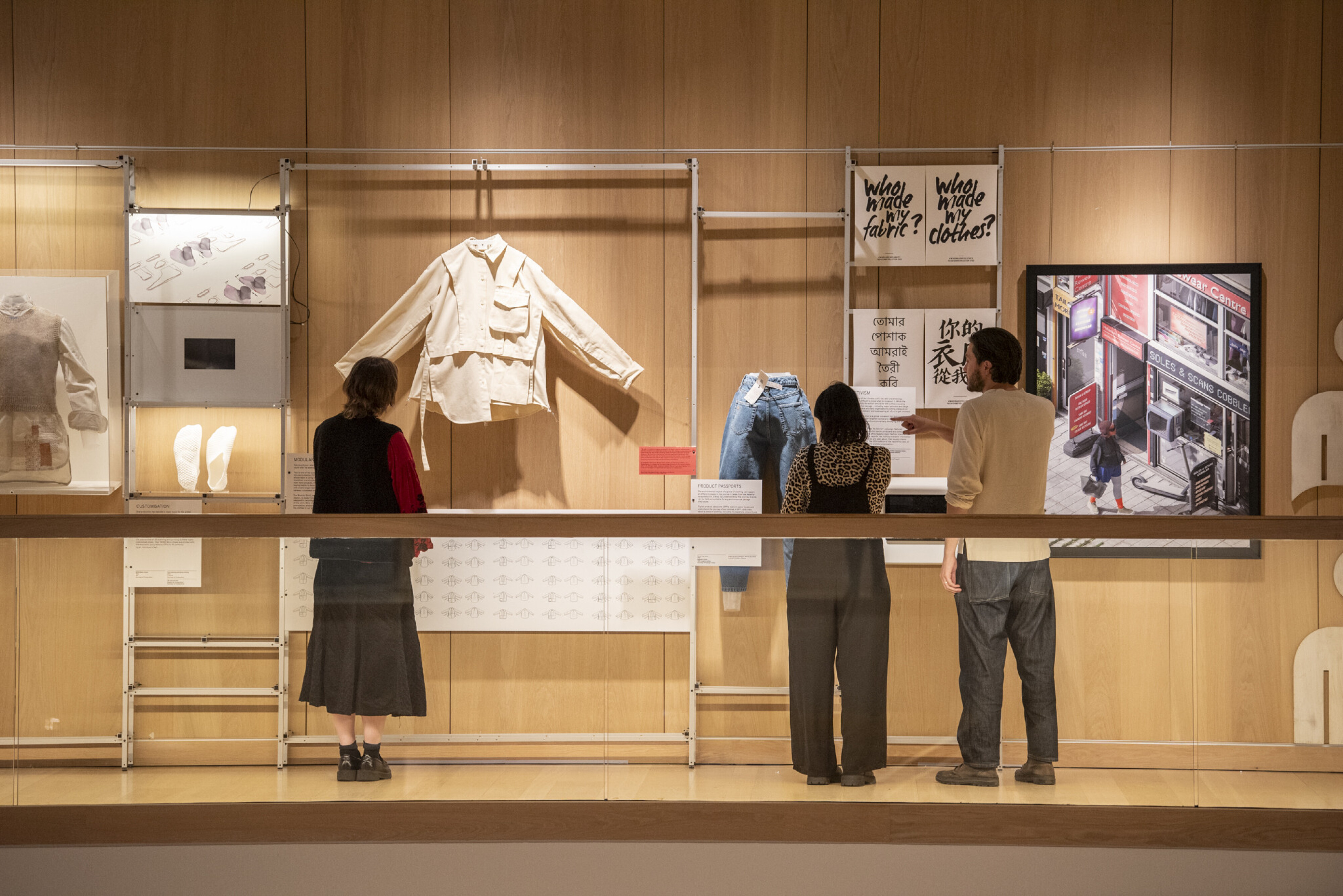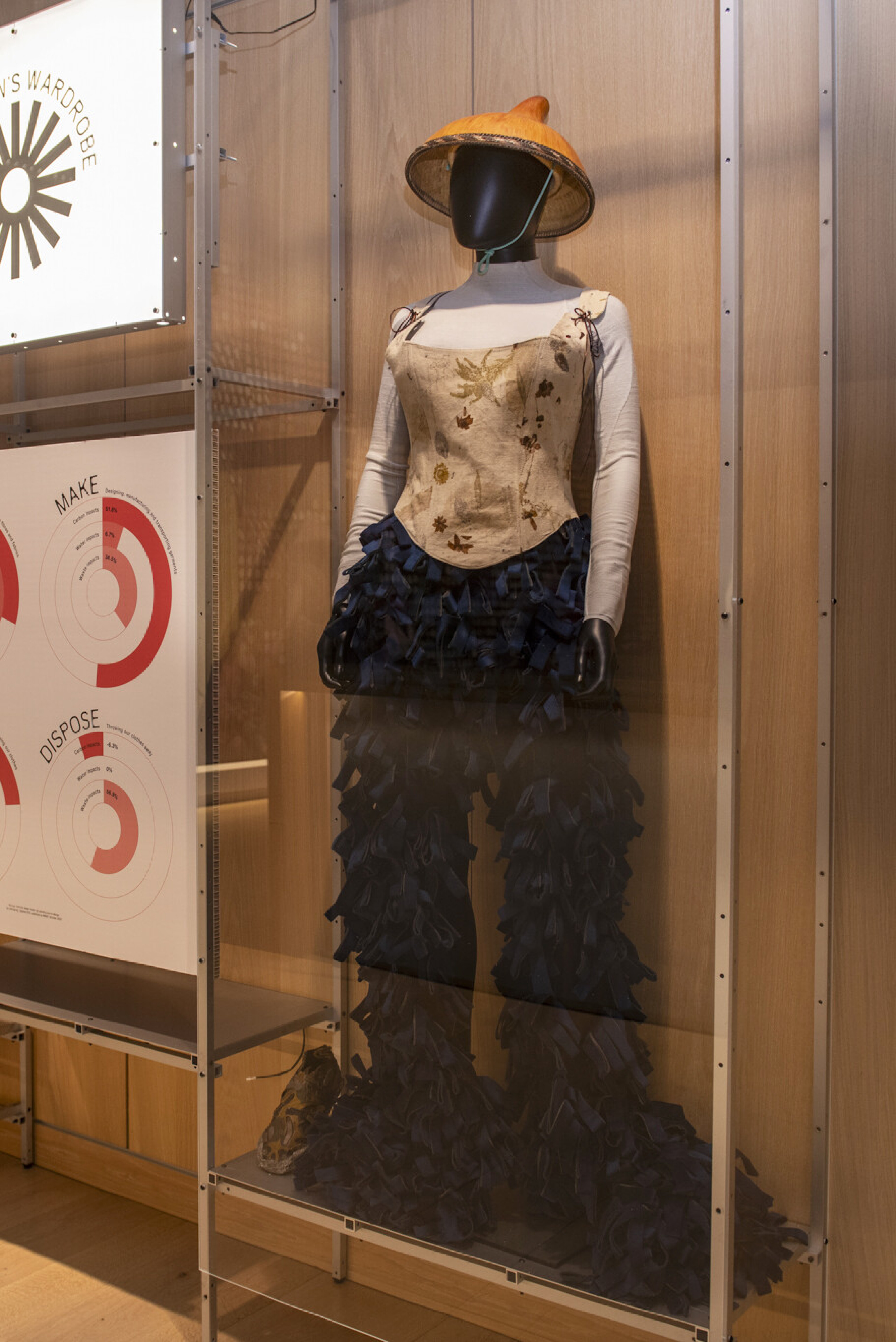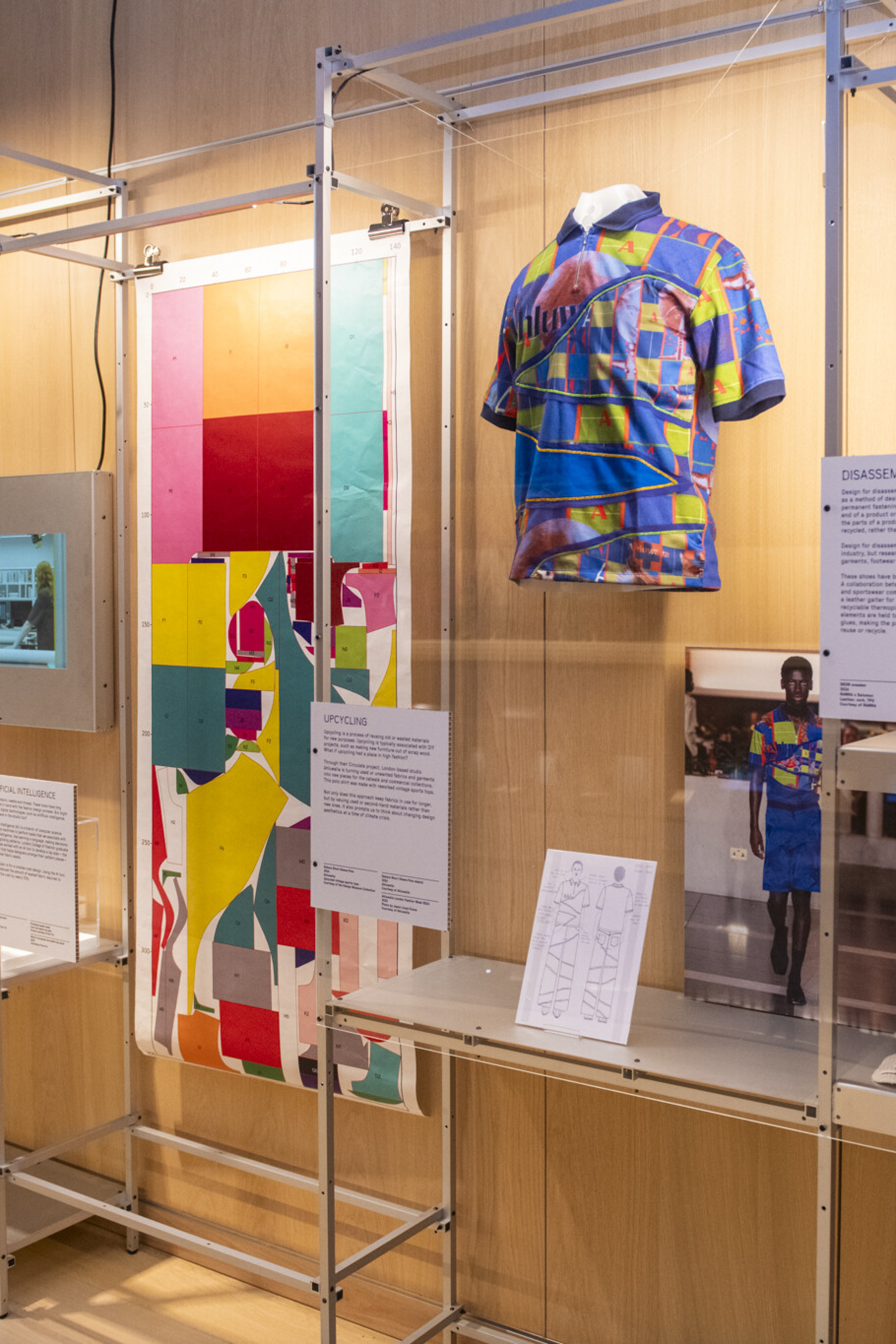 The display opens with an interactive work by researcher Laetitia Forst produced in collaboration with graphic design studio ACRE, which allows visitors to explore the lifecycles of different popular garments. Visitors can access the tool online at the museum or remotely at GarmentLifecycleMap.com. Learn more on this page.