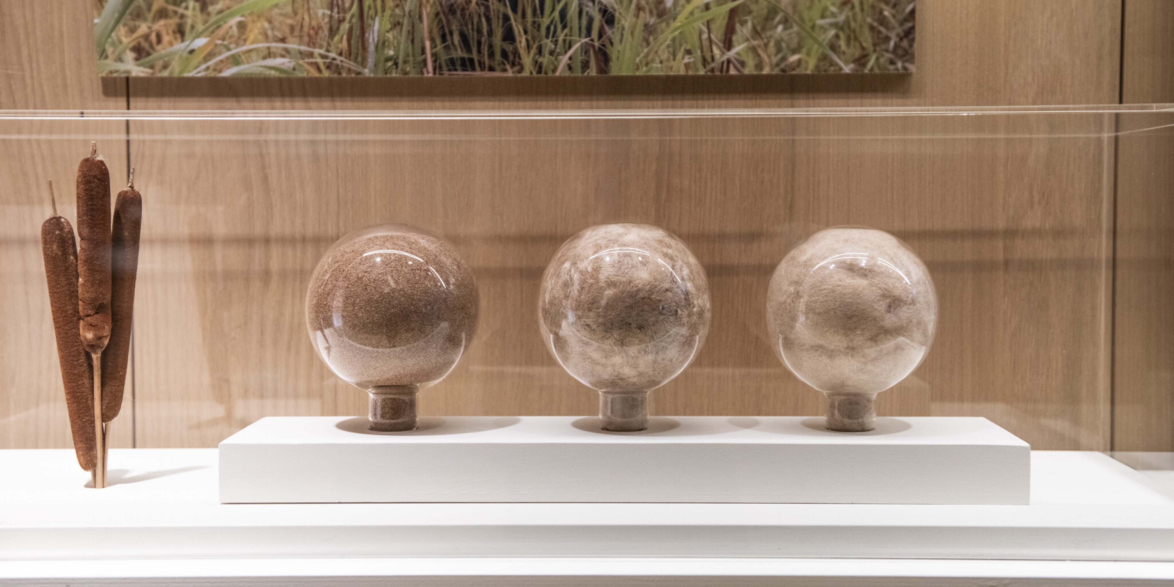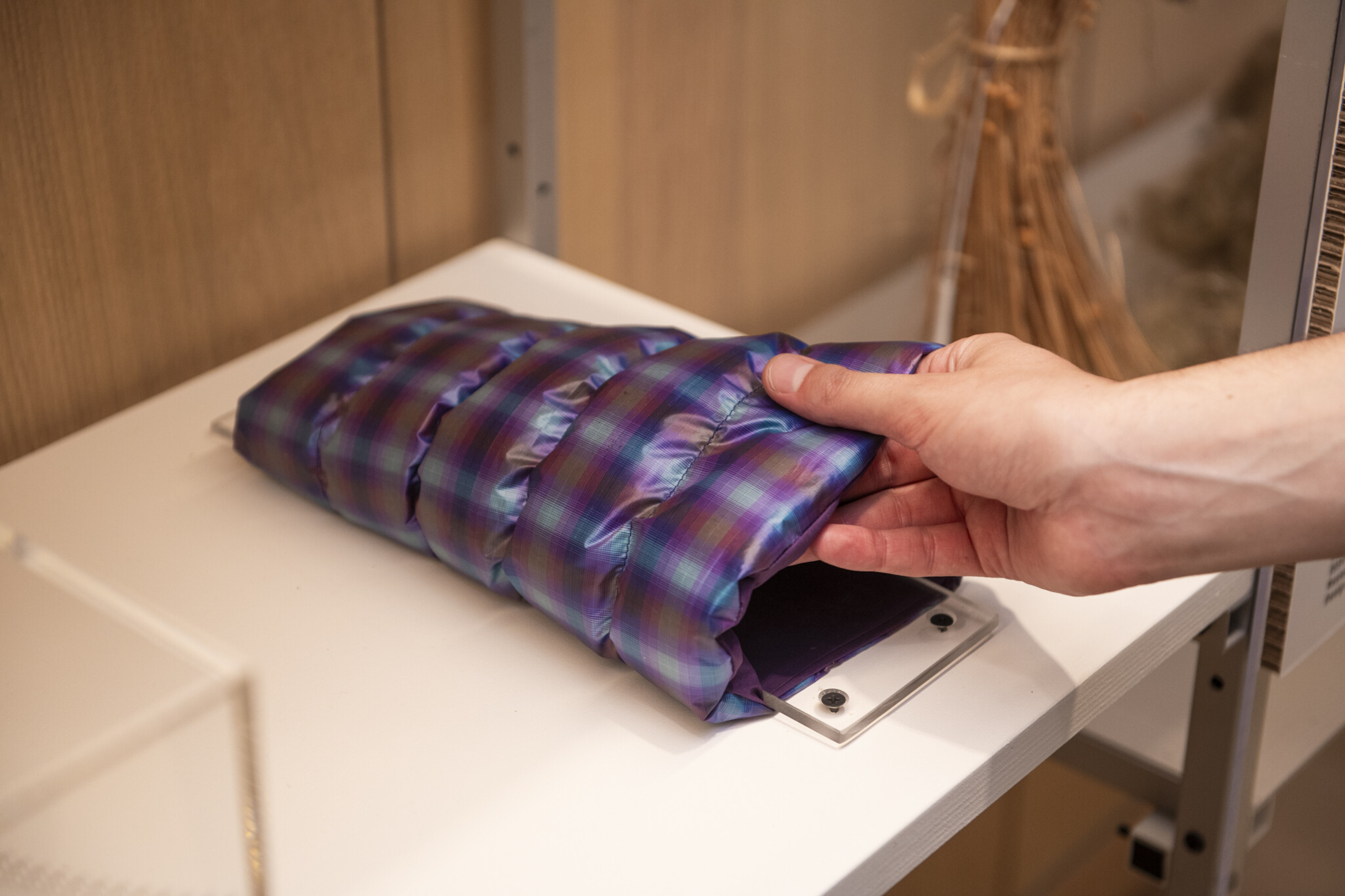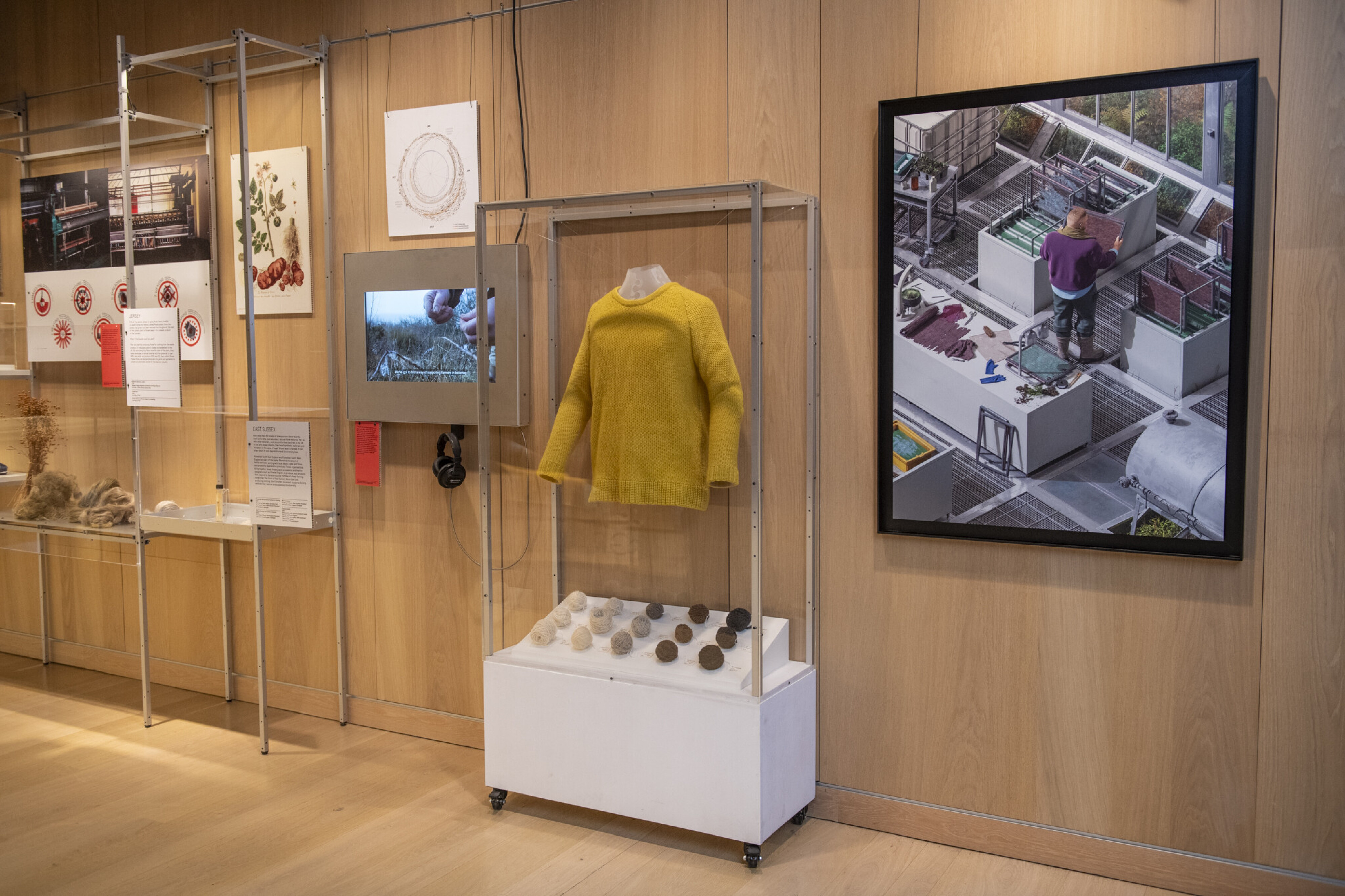 The first section of the display looks at resurfacing industries of textile production in the UK. From Northern Ireland to Jersey, manufacturers are experimenting with alternative production methods and new materials for clothing in ways that both shorten supply chains and regenerate landscapes.