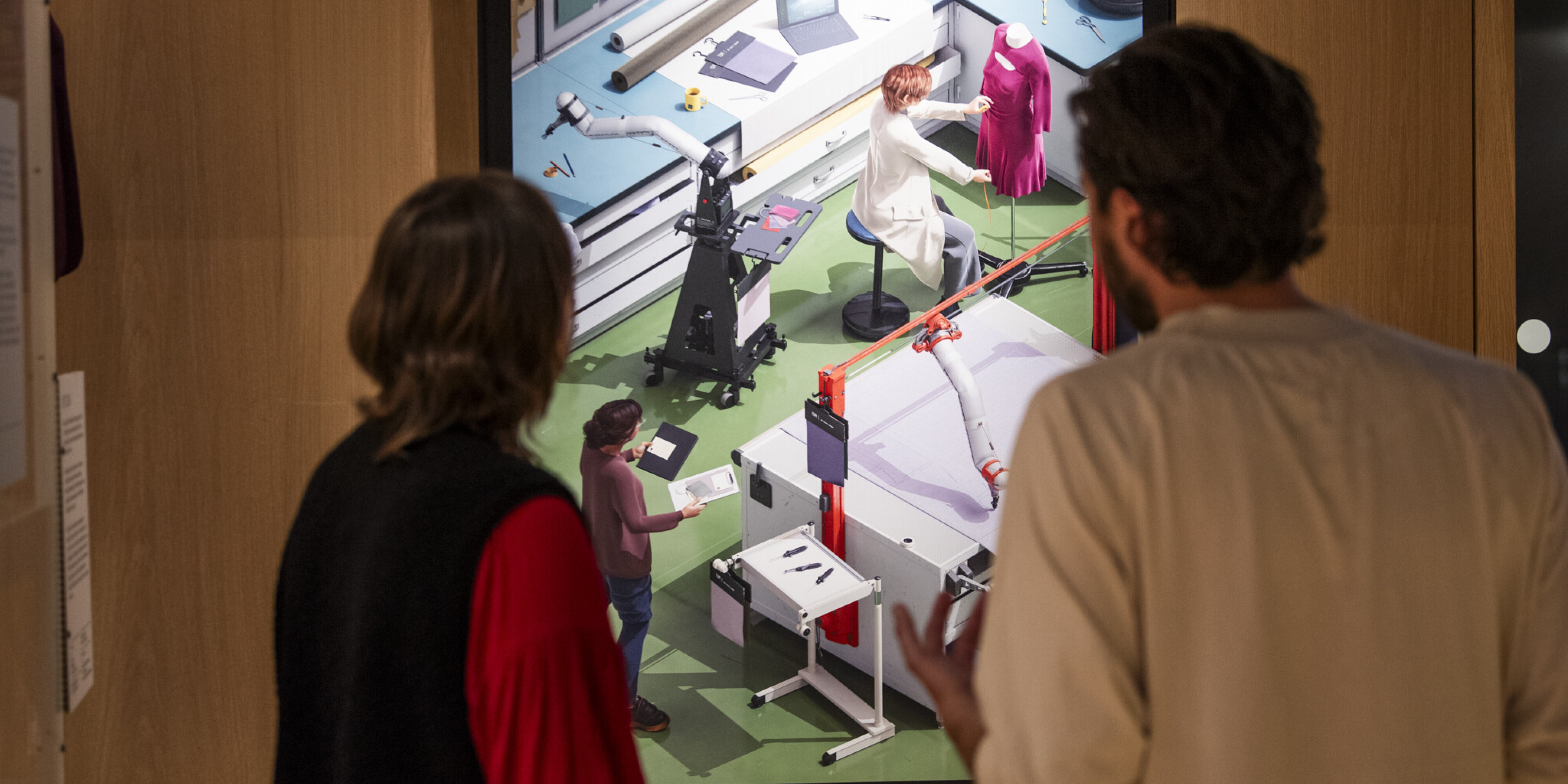 With this intention in mind, the Tomorrow’s Wardrobe curatorial team brought together a creative team consisting of Berlin-based illustrator Max Guther and three leading researchers from fashion and textiles – Kate Goldsworthy, Susan Postlethwaite and Alexa Pollmann – to produce three illustrations, each one corresponding with a section of the Tomorrow's Wardrobe display that depict an imagined scene in the late 2030s.