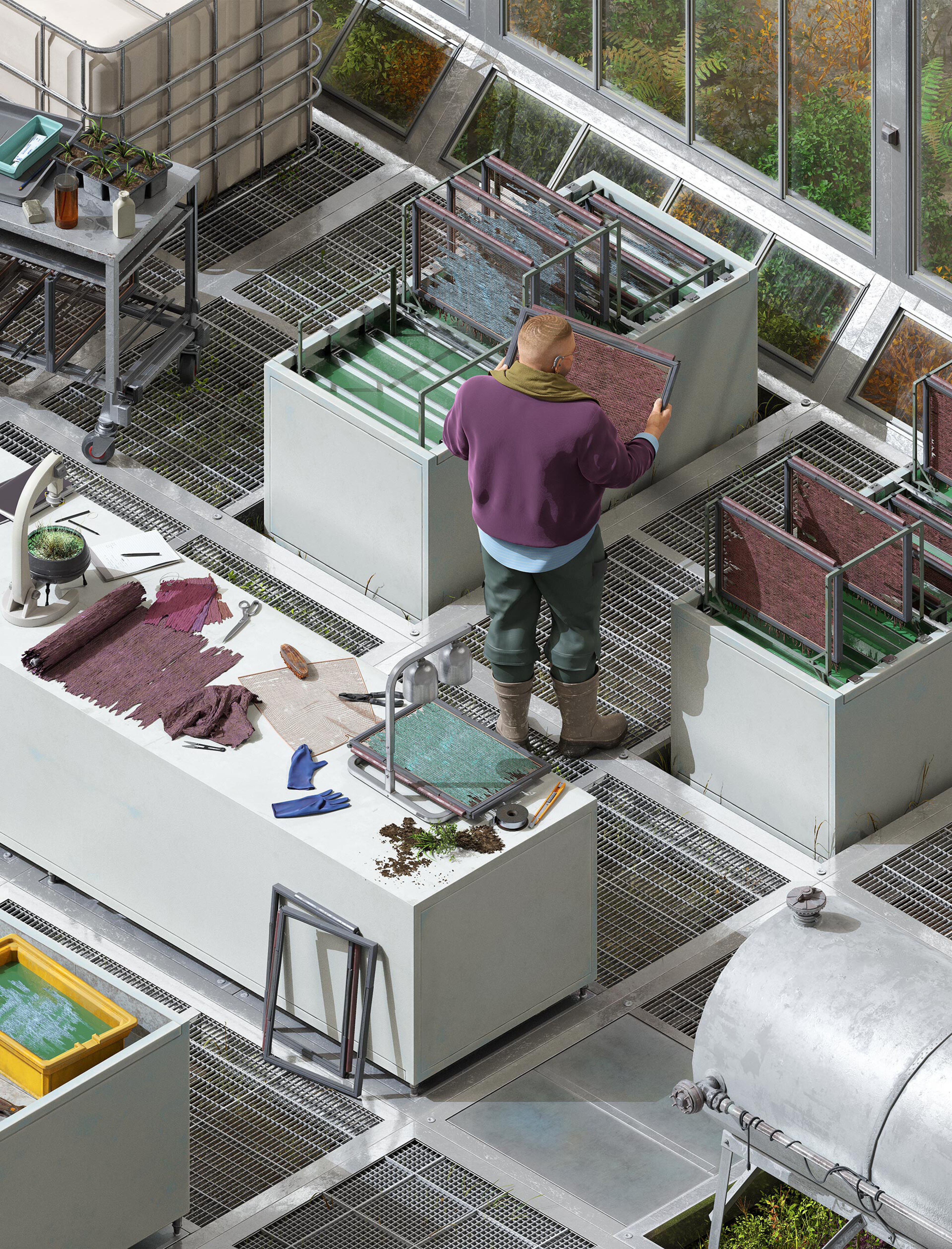 To develop the commissions, the team went through an in-depth process of meetings, workshops, moodboarding and speculating on the future of different parts of the fashion and textiles industry. Building on her research into recyclability and circularity in textile and fashion contexts, Kate Goldsworthy informed the direction of the first illustration accompanying the ‘Textile Landscapes’ section of the display. The resulting image explores the potential of lab-based experiments, agricultural waste and non-toxic materials.