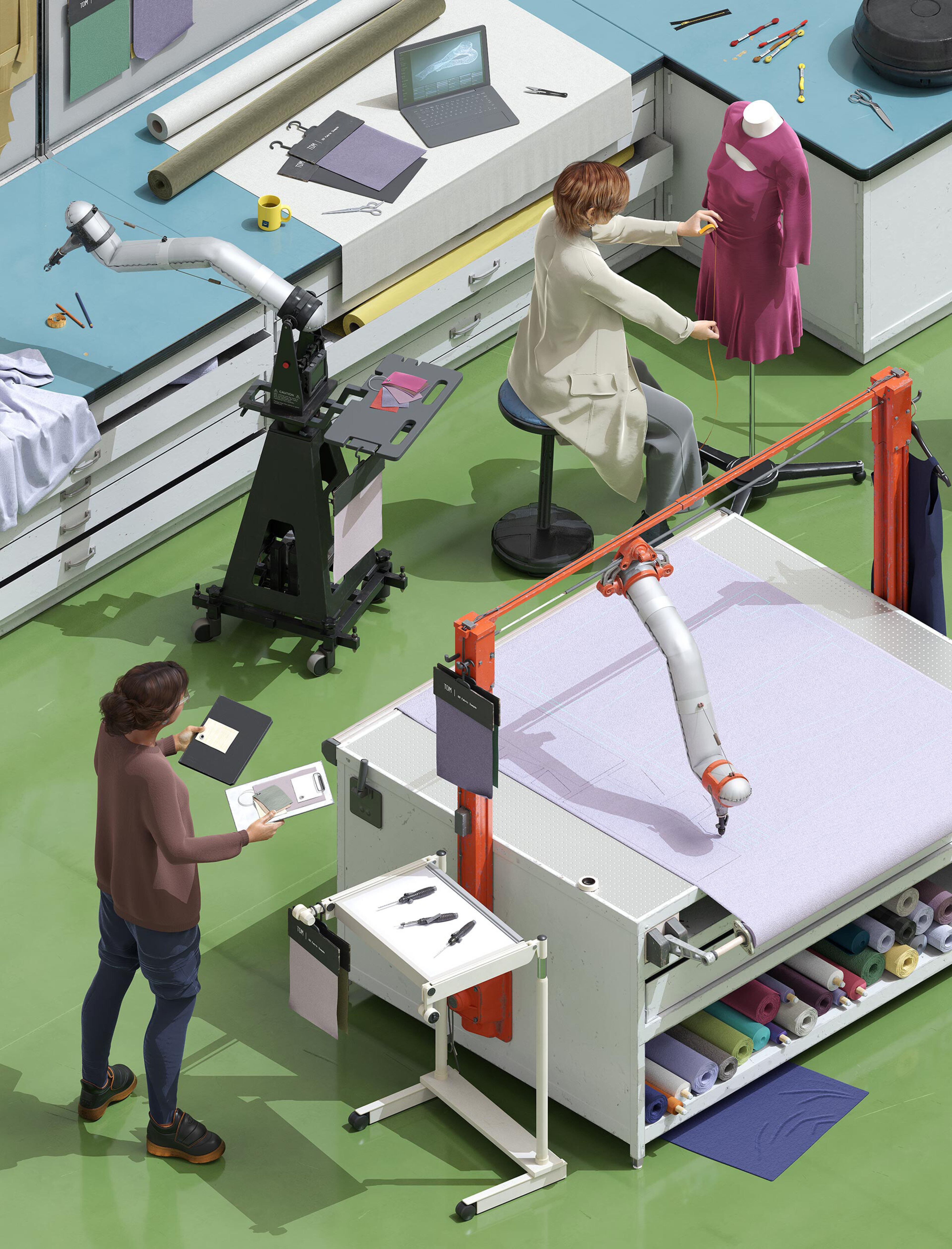 The second section of Tomorrow's Wardrobe, ‘In The Studio’, features projects changing the way fashion designers will work in years to come with a focus on tools. For the illustration, Susan Postlethwaite’s work with the Robotics Living Lab (RoLL) at Manchester Fashion Institute was a major source of inspiration. The lab is developing a new suite of collaborative robots, which small fashion and textile businesses will be able to use to bring high quality clothing production back to the UK.