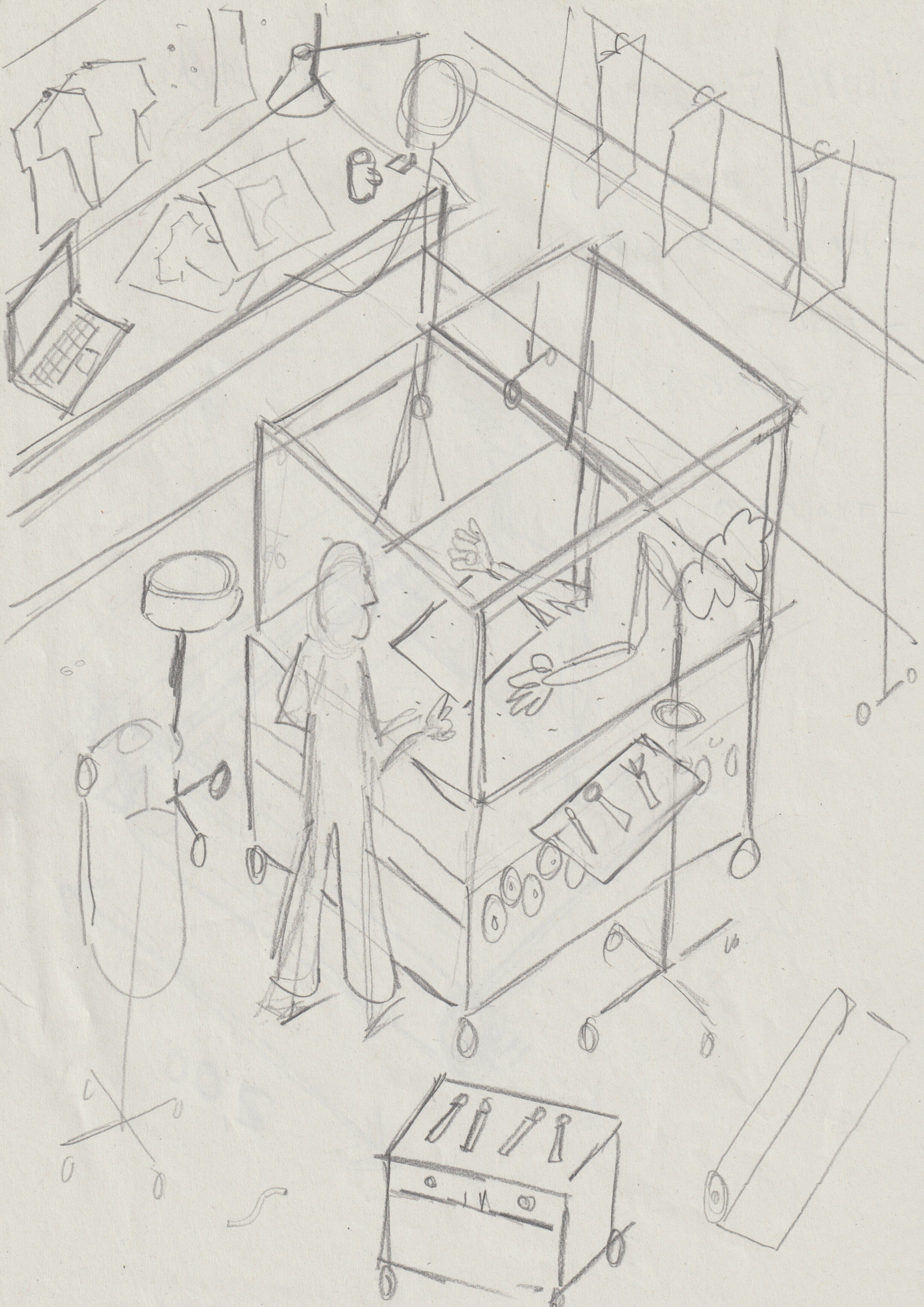 For the final section of the display, Alexa Pollmann was keen to emphasise the role of highstreets in the future of fashion. There already exists a vast network of makers and repair workers across the UK who will be vital in the future of sustainable fashion. Rather than replace those social infrastructures, this third illustration seeks to revalue and augment them with emerging technologies such as 3D printing and scanning.